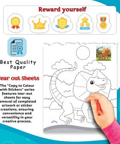 Travel back in time with Gowoo’s Copy to Colour Dinosaurs, a prehistoric coloring adventure sized perfectly for little hands at 8.5 x 11 inches. This exciting book is filled with awesome dinosaur waiting to be brought to life by your artistic touch. The unique copy coloring format helps you develop your artistic skills. Each page features a bold illustration alongside a blank outline, allowing you to replicate the vibrant colors or create your own unique masterpiece. Whether you’re a coloring pro or just starting out, this book offers a fun and engaging way to explore the world of dinosaurs. But wait, there’s more! Unleash your inner paleontologist with a sheet of colorful dinosaur stickers (included on a separate page). Use your creativity to cut out the stickers and add them to the coloring pages, bringing your prehistoric world to life! From fierce Tyrannosaurus Rex to playful Triceratops, these stickers let you customize each scene and create your own dino dioramas. So grab your crayons, markers, or colored pencils, and get ready for a roaring good time! Gowoo’s Copy to Colour Dinosaurs is the perfect way for children to develop artistic expression, learn about dinosaurs, and have hours of prehistoric fun!