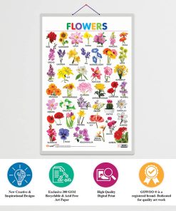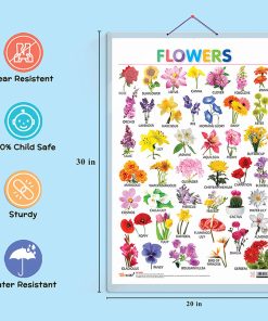 “Introduce your child to the beauty of flowers with our flower chart. Measuring 20*30 inches, this chart features stunning images of various flowers, allowing children to learn about different species while enhancing their visual skills. The chart includes the names of the flowers, helping children learn to spell and expand their vocabulary. Our flower chart is made of high-quality, non-tearable, and waterproof material, ensuring it can withstand regular use’s wear and tear. The double-sided lamination makes it easy to clean and maintain, allowing it to remain in excellent condition for a long time. This chart is ideal for homeschooling and kindergarten and nursery students. It adds an element of fun and visual appeal to learning about flowers, making it easier for children to retain information. It also helps foster an appreciation for nature and the environment. Hang it up in your child’s room, classroom, or study area to add colour and enhance the learning experience. Our flower chart is the perfect addition to any child’s learning journey.”