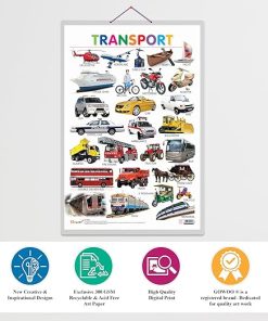 The Hard laminated Transport chart is a remarkable educational tool, generously sized at 20 inches in width and 30 inches in height, meticulously designed to take learners on an exciting journey through the diverse world of transportation. With its oversized and bold fonts, this chart ensures that modes of transport are not just visible but easily recognizable, making it a fantastic addition to classrooms, playrooms, and homeschooling environments where young minds are eager to embark on a voyage of discovery. Built with durability in mind, this chart is water-resistant, tear-resistant, and dust-resistant, ensuring it can withstand spills, frequent handling, and the test of time while preserving its educational value. It’s a long-lasting investment that can withstand the demands of educational settings, accompanying learners on their exploration of transportation for years to come. Safety is a primary concern, and the Transport chart is meticulously designed to be 100% child-safe, adhering to stringent safety standards. Parents and educators can confidently rely on its safety and durability, making it a perfect tool for children to explore and understand the vibrant and multifaceted world of vehicles and modes of transport. Each mode of transport on the chart is thoughtfully accompanied by realistic and captivating pictures, providing an immersive visual experience. This visual engagement connects modes of transport to real-life contexts and kindles an appreciation for the role these vehicles play in our daily lives. In summary, the hard laminated Transport chart is a robust and child-safe educational resource that introduces learners to the exciting world of transportation. Its large fonts, durability, and realistic pictures make it an invaluable tool for educators, parents, and young learners eager to explore and understand the captivating realm of modes of transport and their significance in our society.